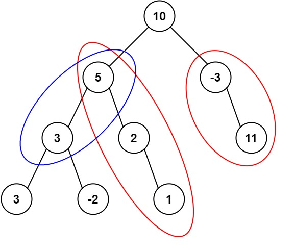 输入:root = [10,5,-3,3,2,null,11,3,-2,null,1], targetSum = 8